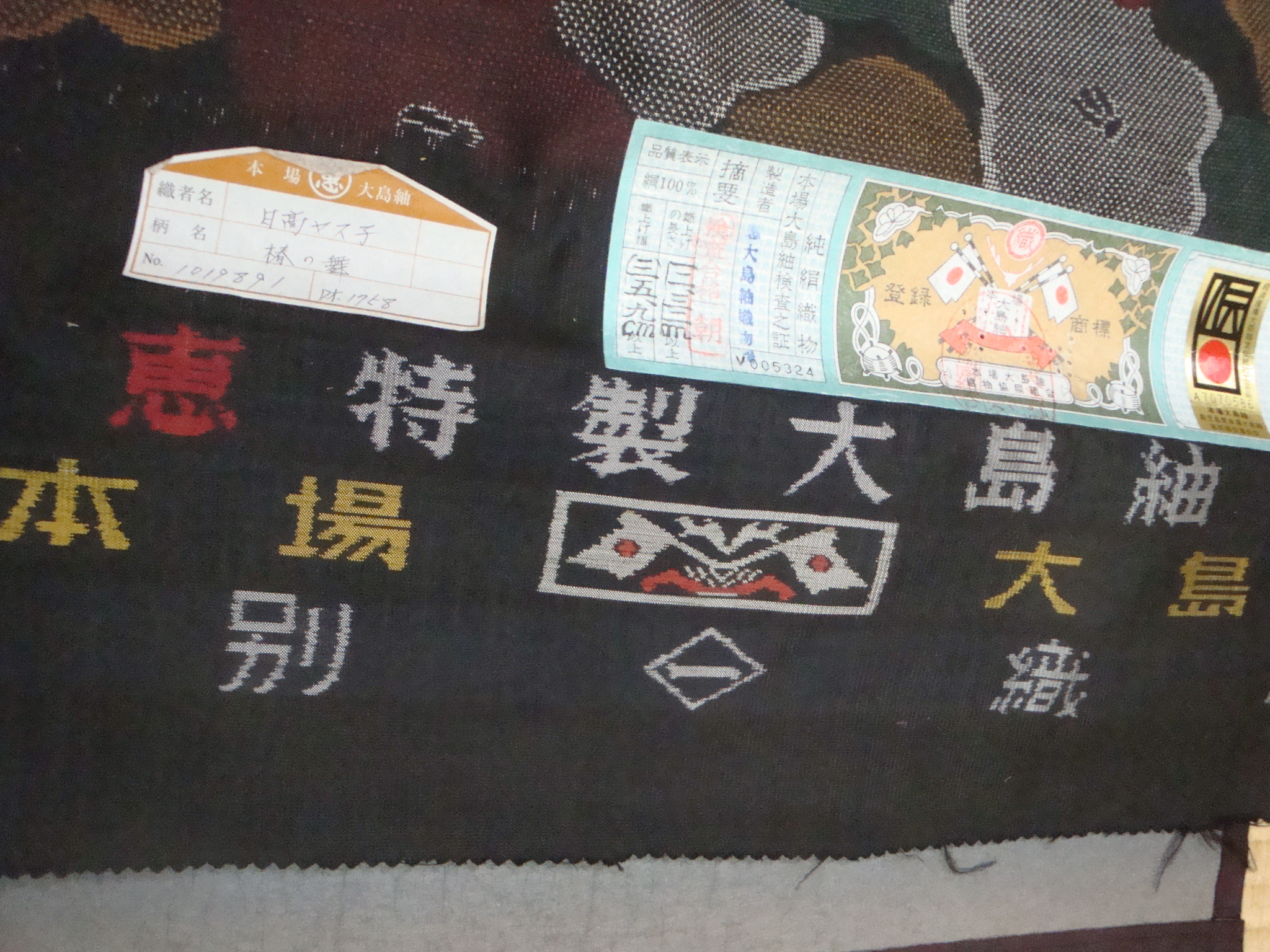 反物の一番端の部分に、別織・別誂の文字と共に「菱に一文字」のロゴが織り出されている。これがあるおかげで、この大島が一目で菱一のオリジナル品と判る。最初の椿柄を製織した恵は、組合証紙に旗印が付いているので鹿児島の機屋。この露芝柄は地球印・奄美の組合に所属する平田絹織物。問屋の誂え品は、ある程度まとまった数を製織することになるので、依頼する機屋の規模は自然と大きな所になる。
