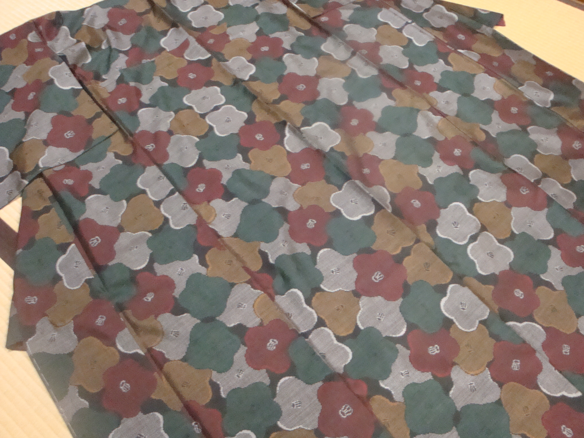 模様は椿を丸く図案化した、光琳梅。尾形光琳は、植物モチーフを丸みを持った線で描いていたが、こうした特有の図案には光琳の名前が冠せられ、光琳椿とか光琳梅といった図案名が付いた。この大島は光琳椿を連続させ、しかも赤・黄・緑・白の四色を使った多色紬。一般的な大島とは違う、モダンで洒落た柄行きである。優れたデザイン性を感じさせる大島で、今こんな品物は探してもなかなか見つからない。