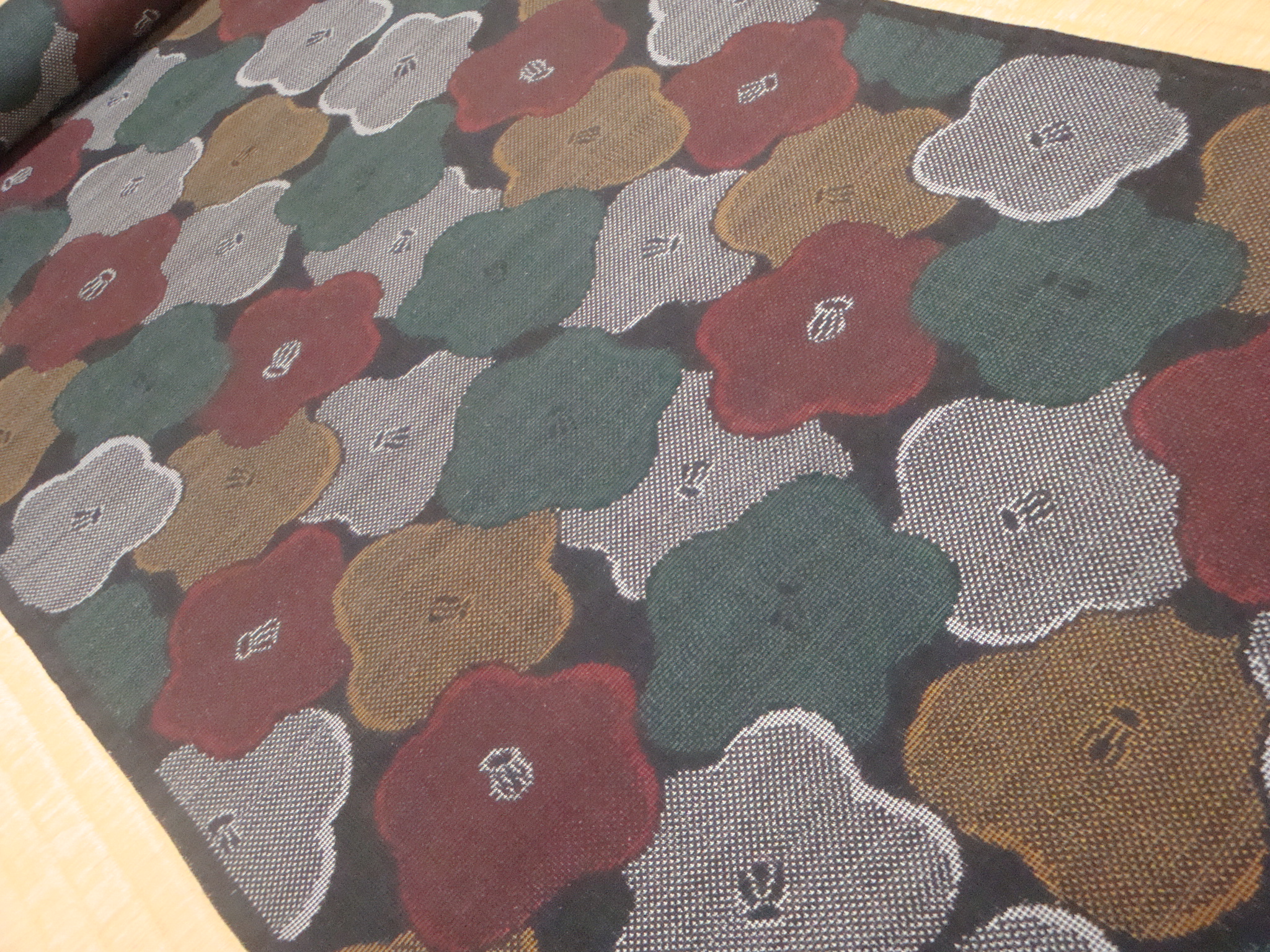 (菱一止め機 光琳椿模様 一元絣9マルキ泥大島・鹿児島 恵織物)