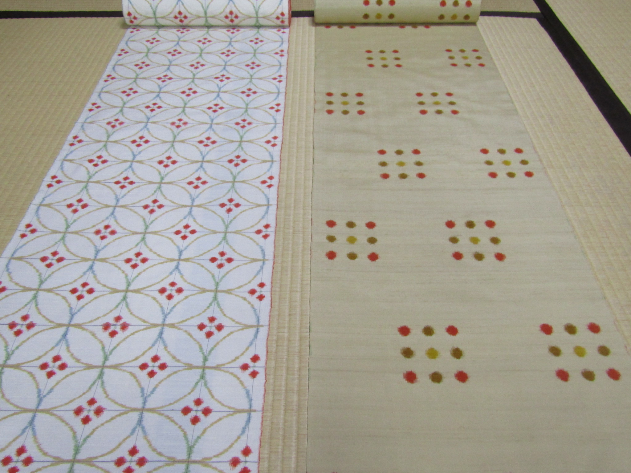 (左:菱一止め機 切紙絣 右:千切屋止め機 四角ドット絣 十日町・根啓織物)