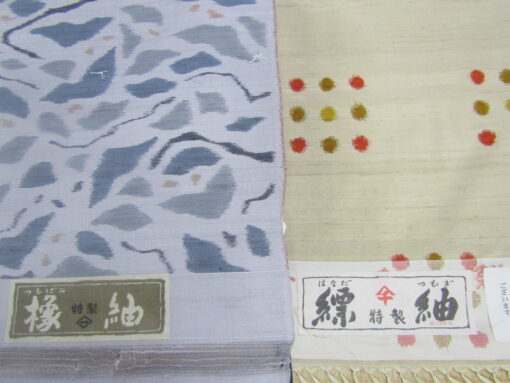 そんな目論見に応じるように、問屋では上の画像のような絣図案を提示して、十日町の機屋で製織させた。右は菱一の橡(つるばみ)紬、左は千切屋の縹(はなだ)紬。こうしてラベルをみるとよく似ており、品物のネーミングも似通っている。右の千切屋製の絣は、つい先日仕入れた品物だが、その時見た品物の中に、以前菱一で橡紬として売られていた絣模様と全く同じものがあった。つまり菱一終業の後、橡紬の絣柄の一部が縹紬と名前を変えて織られていたのである。実際に織ったのは十日町の根啓織物だが、依頼する問屋は変われども、止め機の品物として再び出荷することが出来れば、作り手として、それに越したことは無いのである。