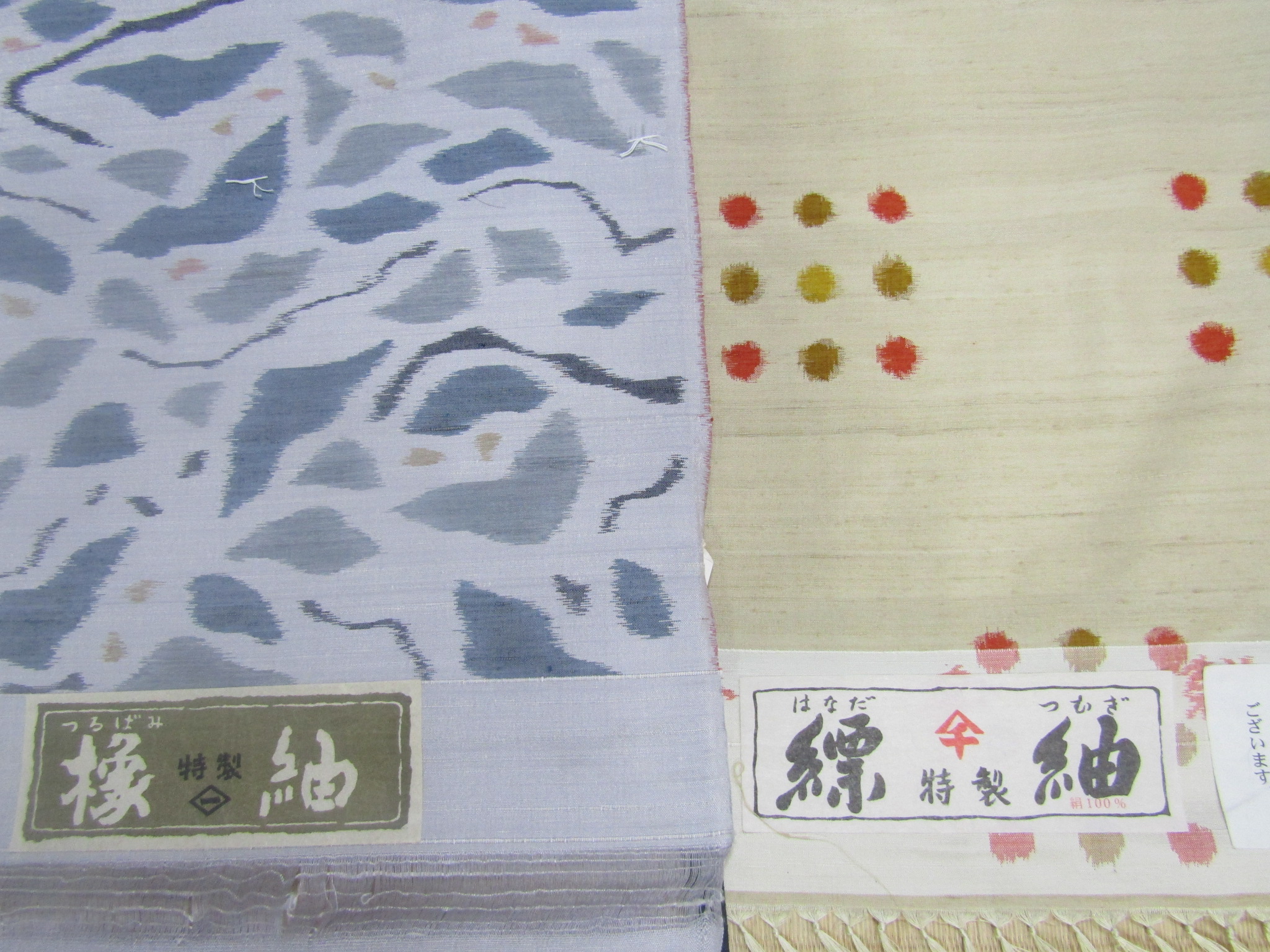 (問屋が企画した、オリジナル十日町紬絣 左二点・千切屋 右二点・菱一)