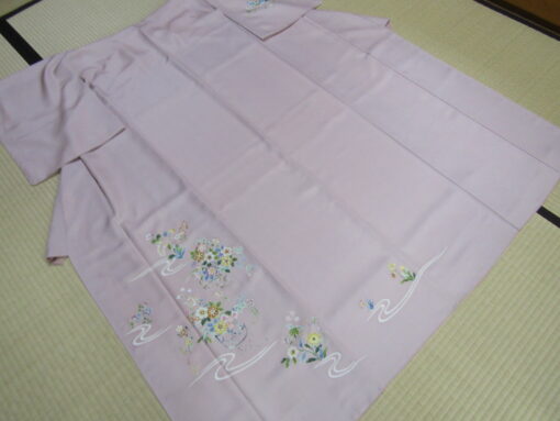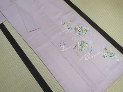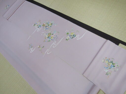 誂え終わった姿を見れば、この付下げの特徴がもっとよく判るだろう。着姿の中心・上前には、大きさを変えた花籠が四つ。その間に水の流れがあるが、各々の模様に繋がりは無く独立している。図案そのものも決して大きくはないが、その分上品さが前に出ている。前述したように、柔らかい糸目と丁寧な挿し色が際立っており、「さりげなさ」が強調されている。