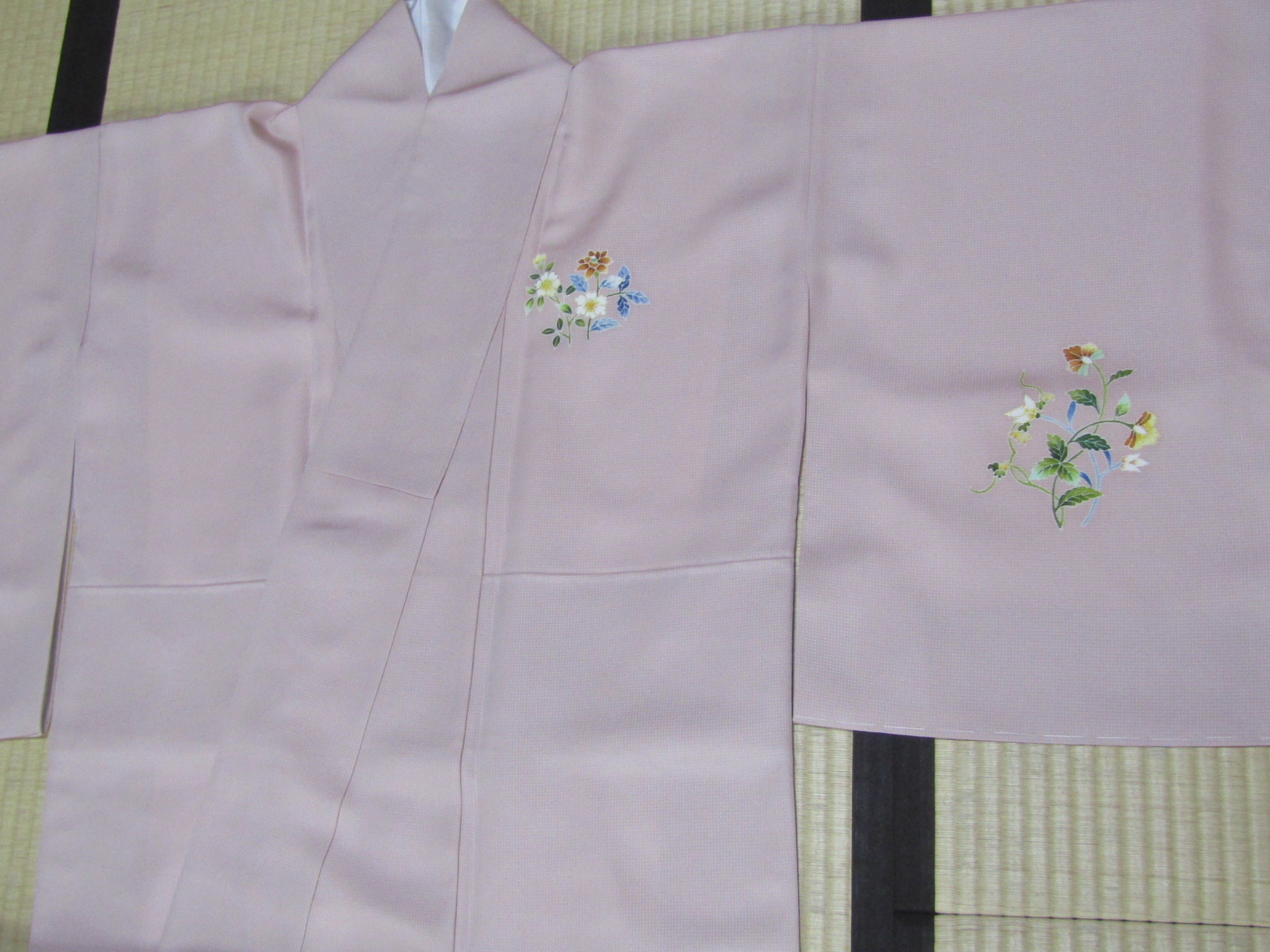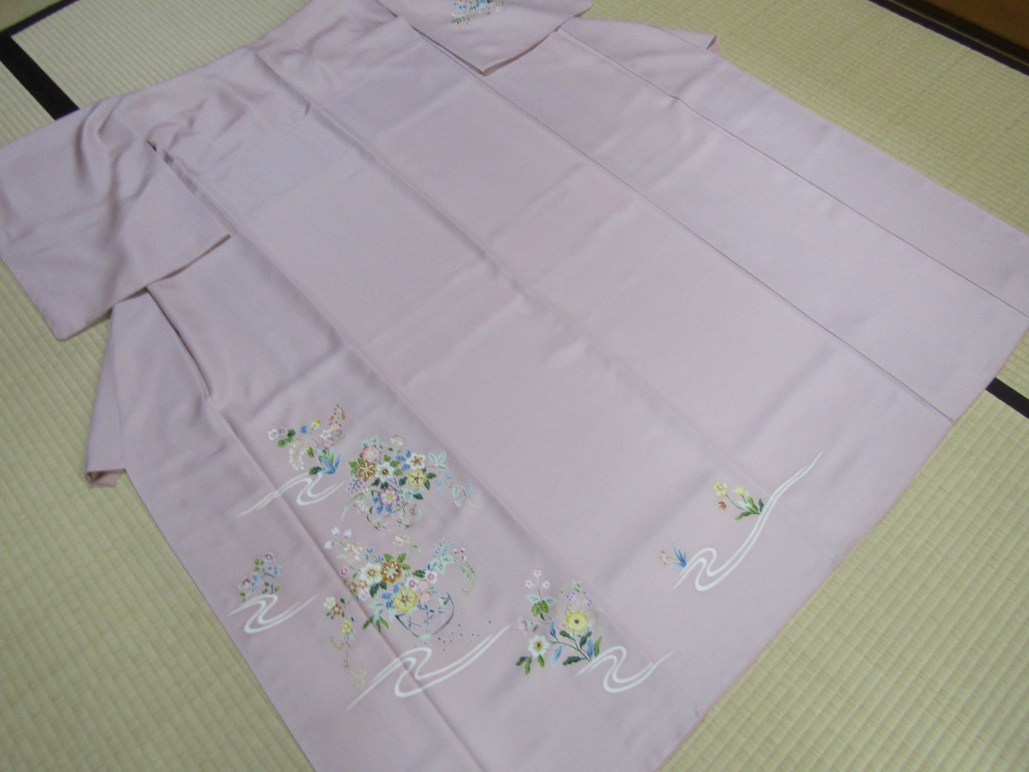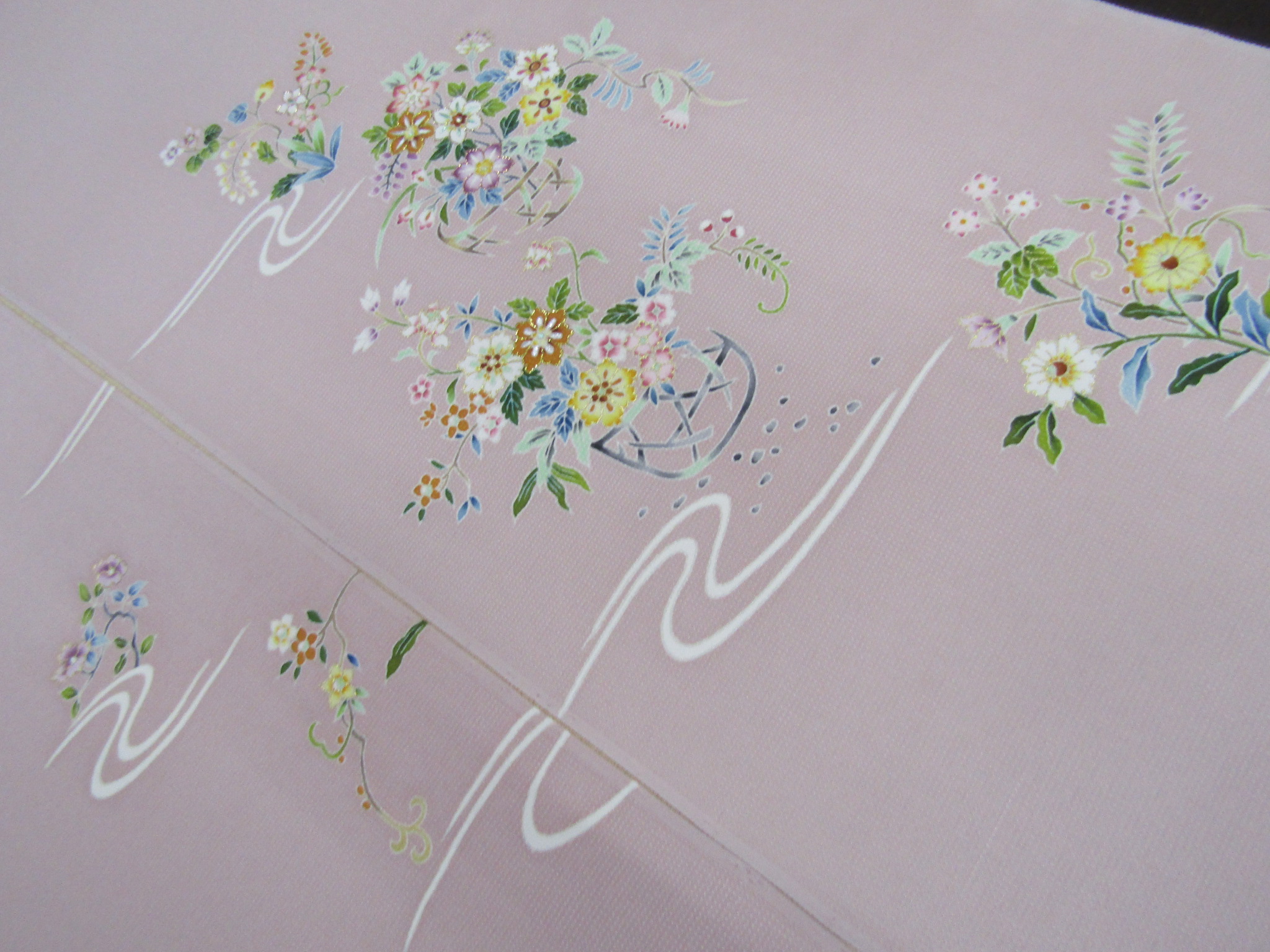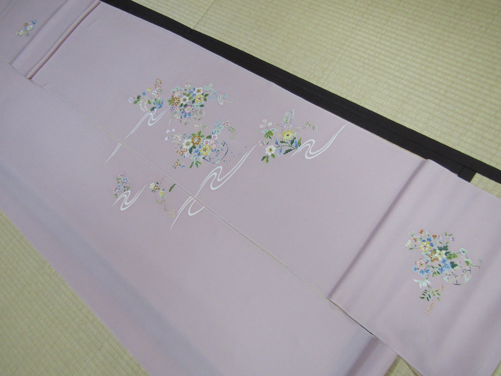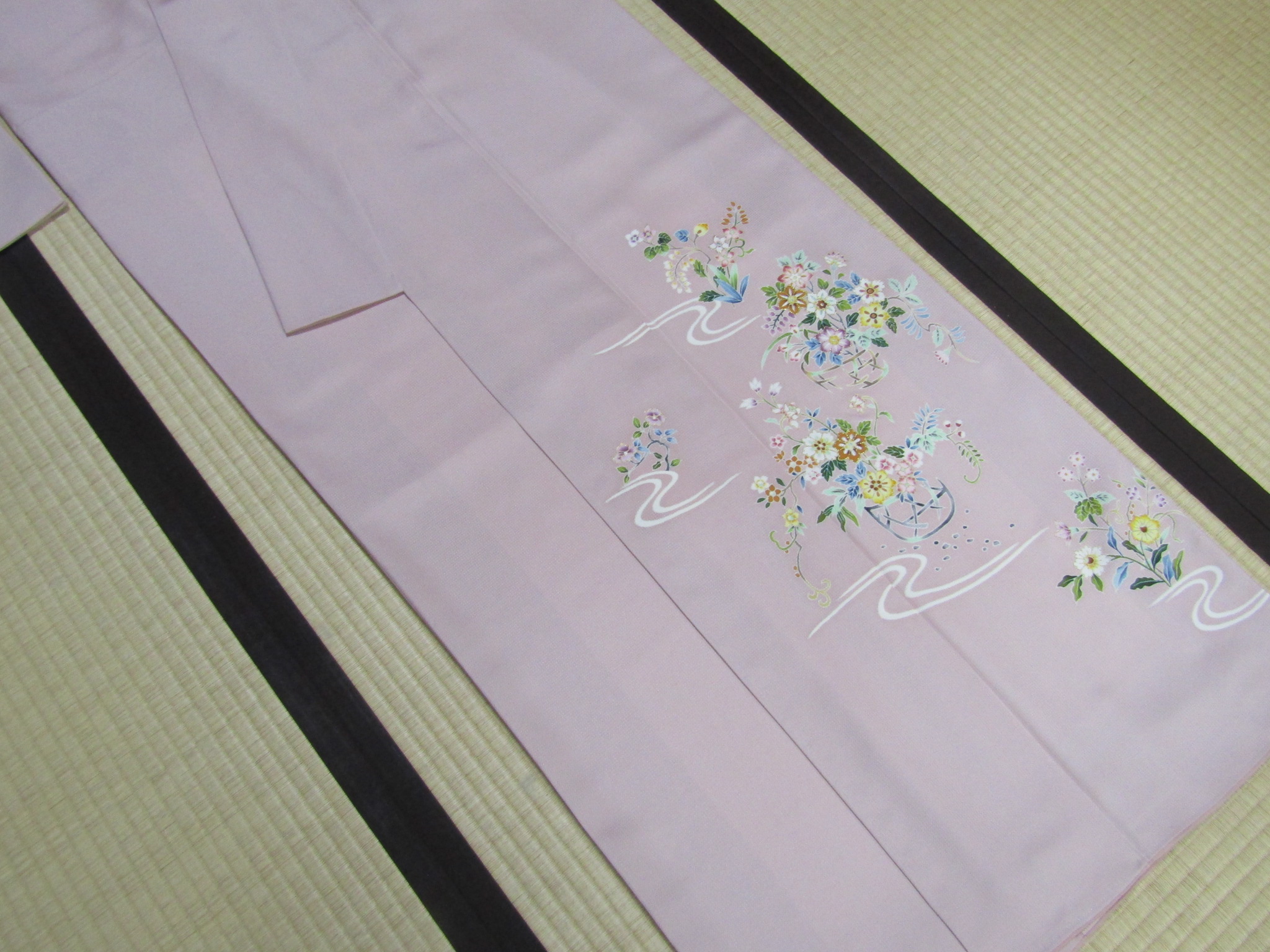 この付下げも、大松らしい上品さがよく表れている図案で、流水と花籠というスタンダードなモチーフを、さりげなく巧みに描いている。上の画像は、模様中心の上前衽と身頃を合わせたところを写したものだが、一見平凡に見えても、そこは手を尽くした手描き・手挿しの本格的な江戸友禅で、きちんと本格的な仕事がなされている。
