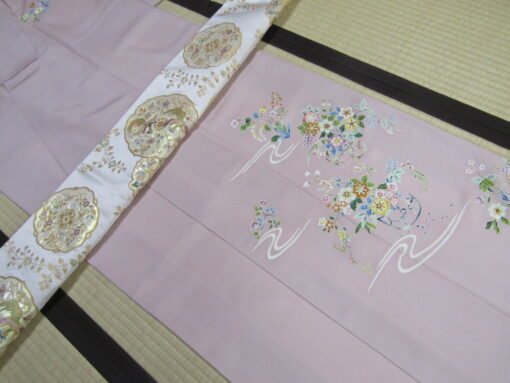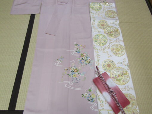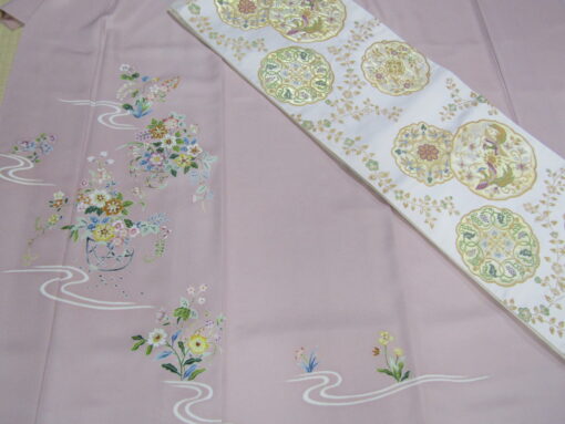 (鴇色 花籠模様・江戸友禅付下げ 白地 鏡裏鳥華文様・袋帯)