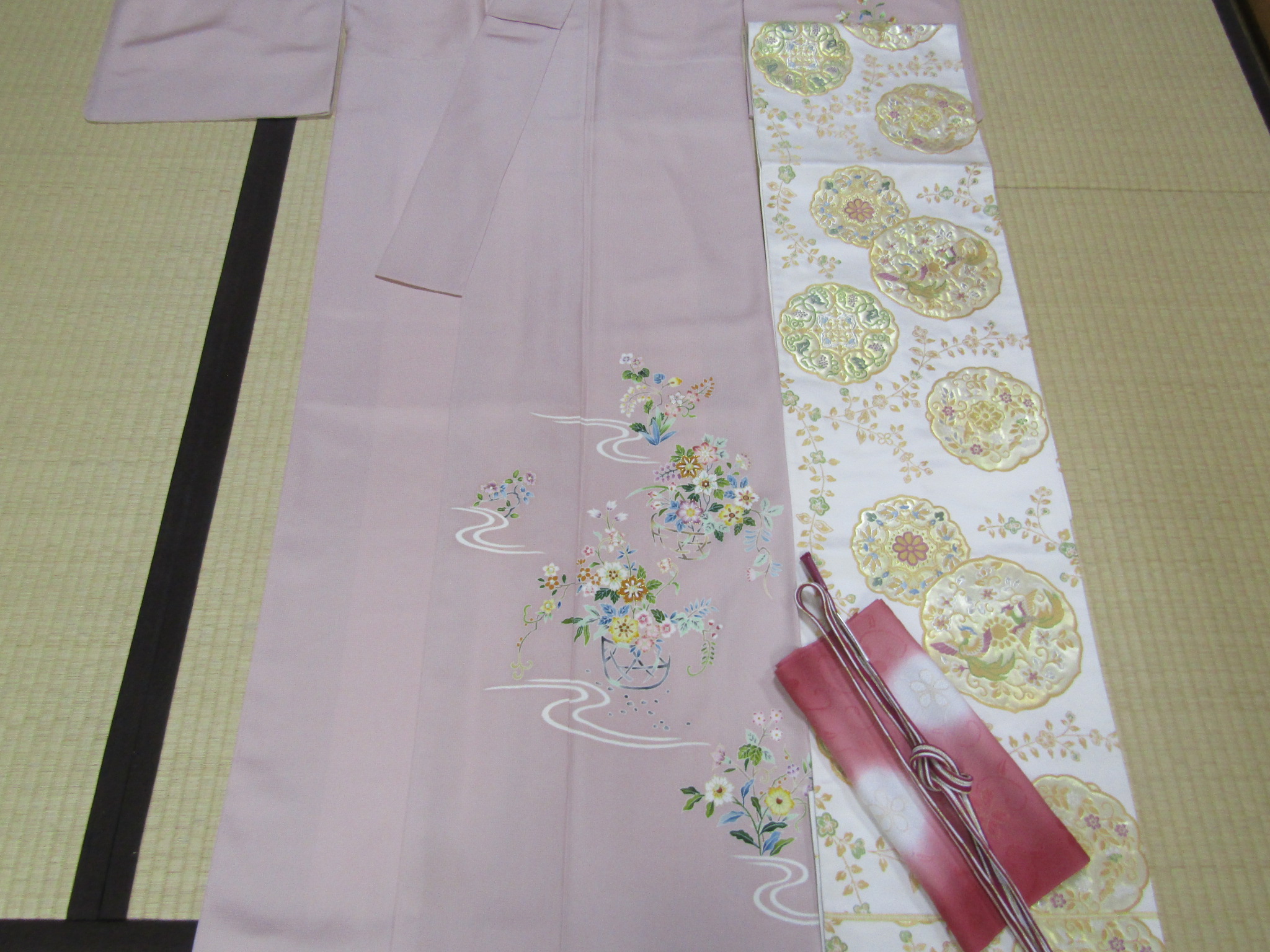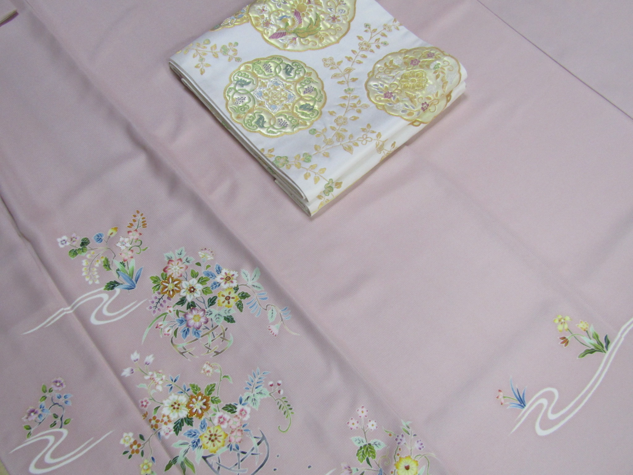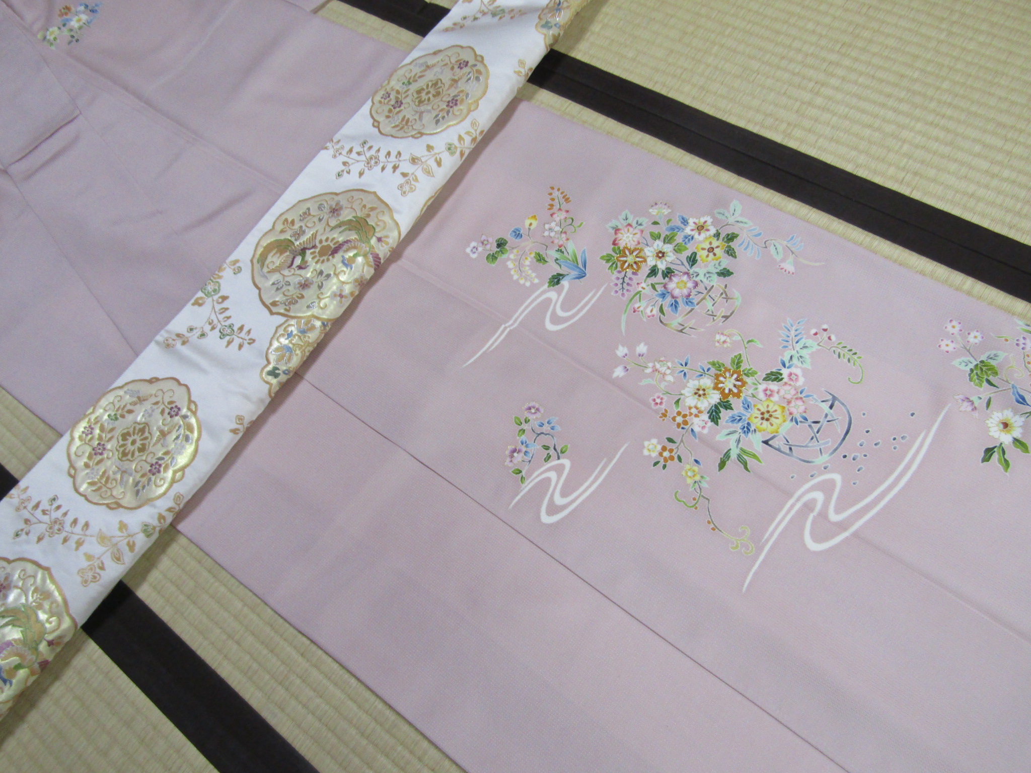 同じ雰囲気を持つ、江戸友禅の付下げと正倉院文様の袋帯。これを組合わせるとどうなるのか、試すことにしよう。