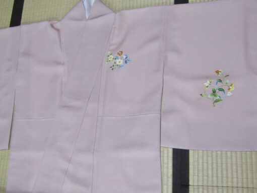 こうした経緯を踏まえれば、訪問着と付下げとの相違が、自然に見えてくる。現在では模様中心の上前衽、身頃、さらには後身頃へと柄が繋がらない付下げなど無いが、意匠から訪問着との違いを見分けるとすれば、それは衿の模様あしらいの有無になるだろう。訪問着の場合、衿に模様があり、それが胸と袖の図案と連動して繋がって一体感のある意匠を演出する。それが付下げでは、衿に模様が付いていないことが多く、胸と袖の図案は孤立している。