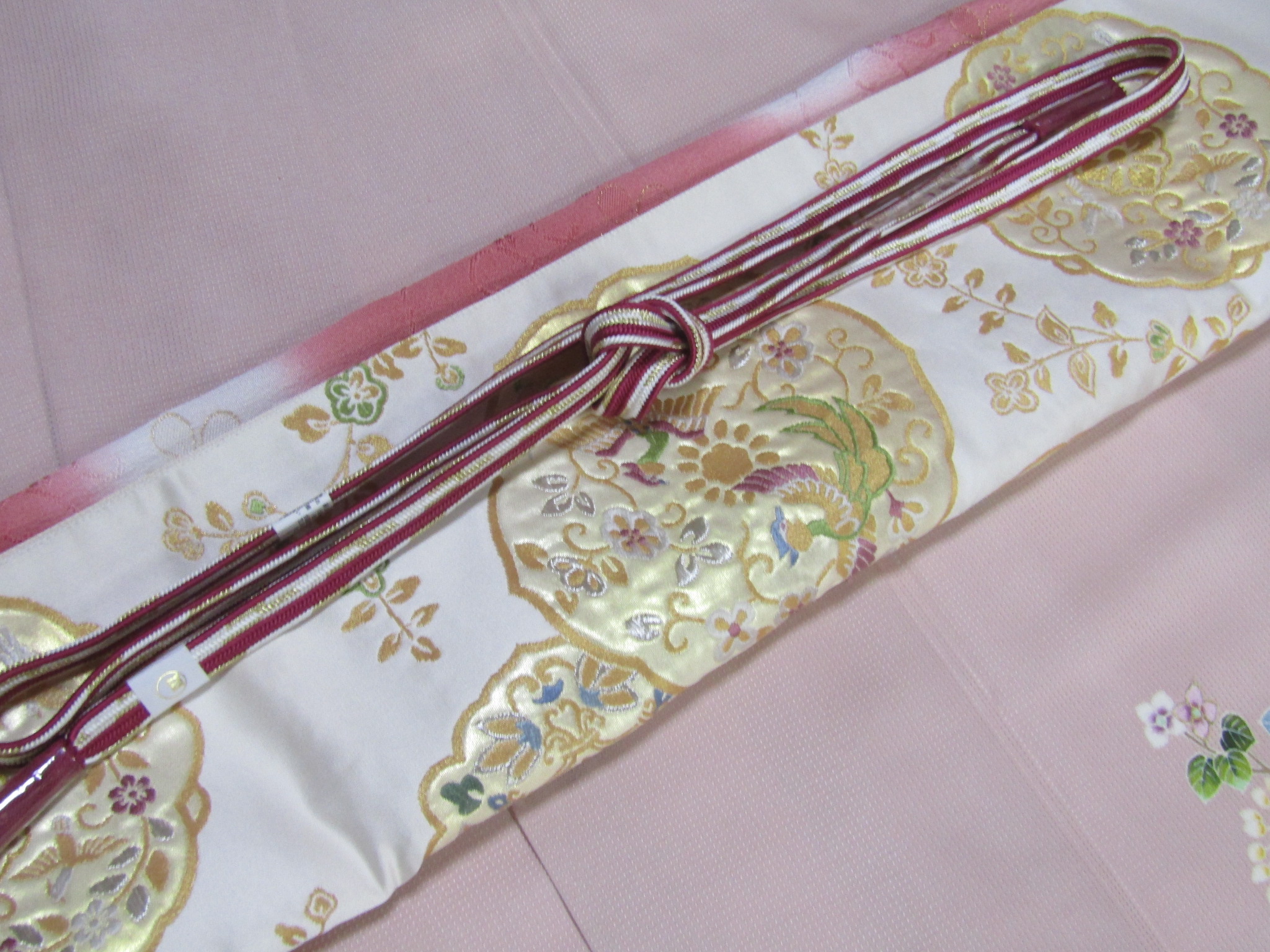 キモノはオーソドックスな花籠文だが、入れ込んである花は鉄線や桔梗を模したようにも、デザイン化された唐花のようにも見える。それが正倉院図案の帯とリンクして、なお双方の雰囲気を近づけている。色の気配はどちらも淡く、鴇色のキモノに白い帯がよく映える。