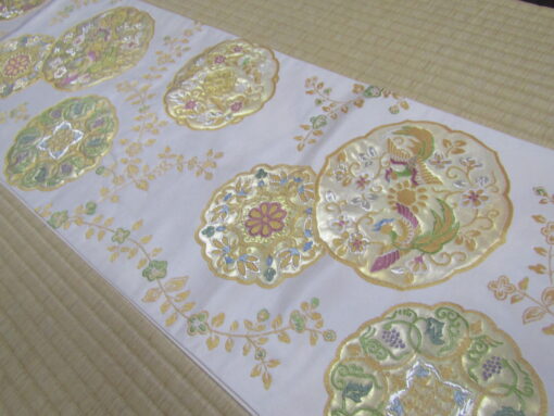 清々しさと華やかさが共存する白地の鏡文帯。どちらかと言えば、国風的な意匠が得意な紫紘だが、この帯に関しては正倉院の図案を模して織られている。配色は紫と緑と水色だが、いずれも淡い色味で優しい雰囲気を醸し出す。帯地が白であることを意識し、あくまで上品な帯姿になるよう考えられた図案と色の配置なのだろう。