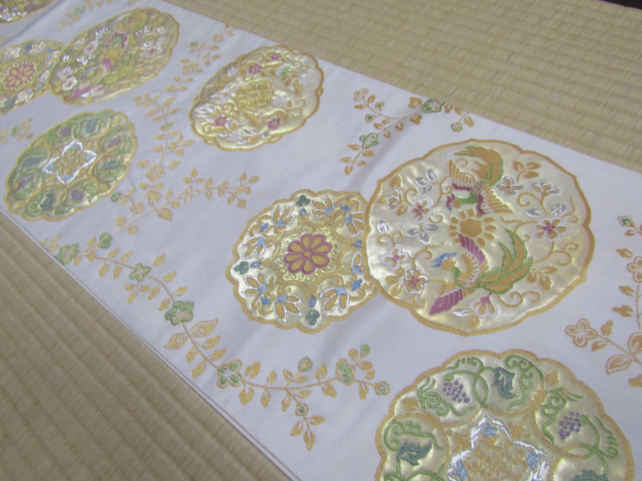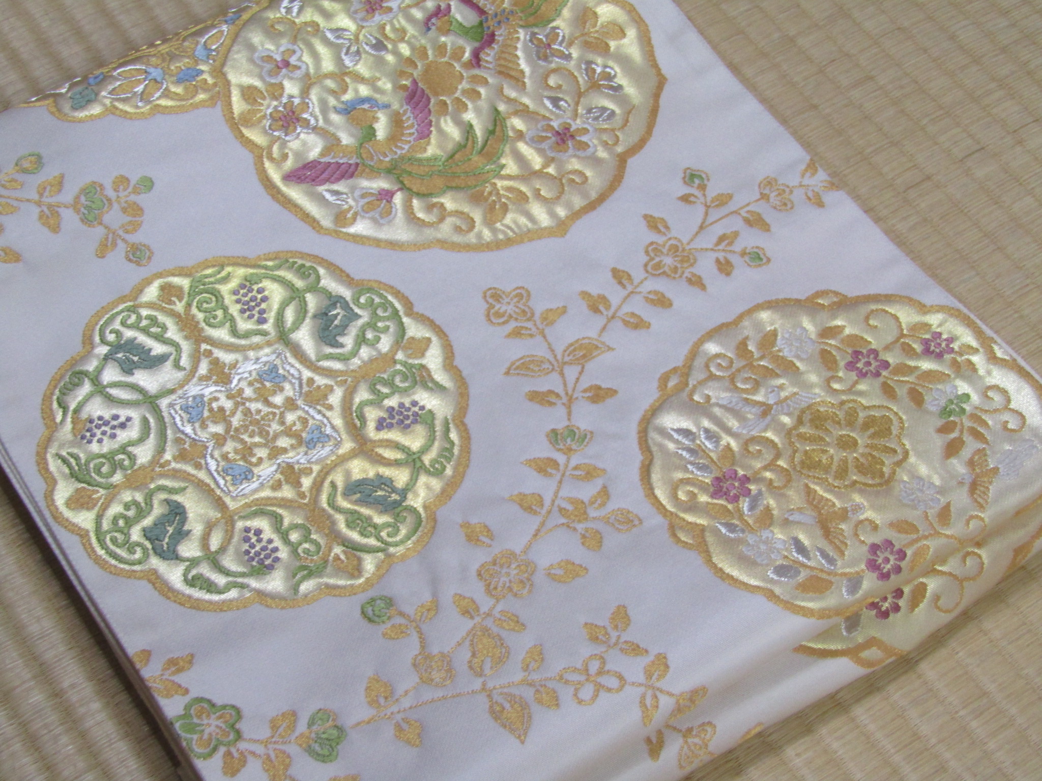 お太鼓を作ってみると、鏡文の配置が絶妙でバランスのとれた帯姿になる。使ってある金糸の色が柔らかいので、派手さは感じられず、上品さをきちんと保っている。図案からしても、格調高いフォーマル帯であるが、決して仰々しくはならない。付下げ同様、作り手の「さりげなく良いモノを」という意識が、帯姿からも感じられる。
