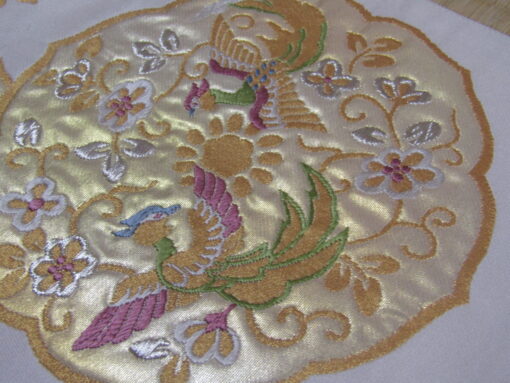 唐花の間を飛び回るのは、二羽の鳥。これも図案は、正倉院の収蔵品をヒントにしている。中倉の収蔵品「密陀彩絵箱(みつださいえのはこ)」には、ナツメヤシをモチーフにした唐草・パルメットの間を、二羽の鳳凰と二羽の怪鳥が旋回している姿が描かれている。「密陀彩絵」とは、顔料や金箔で加工した文様に油をかけて仕上げたもので、現代の油絵に似る。最初の葡萄唐草同様に、こちらも鏡文の形を採っている。