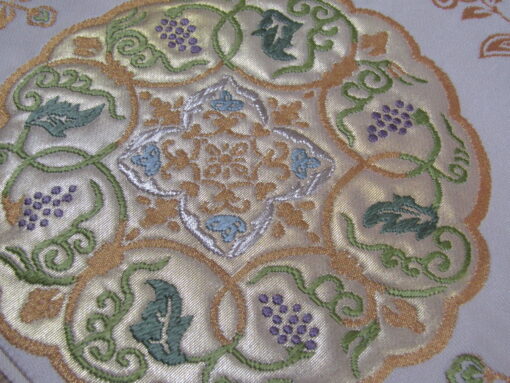 葡萄唐草を周囲に置き、中に四弁の唐花を置く。この図案はおそらく、正倉院南倉の収蔵品「几褥・葡萄唐草文白綾」がモチーフになっていると思われる。几褥(きじょく)とは、仏前の机の上に敷く布のことで、簡単に言えばテーブルセンターの類。収納品は、称徳天皇(聖武天皇と光明皇后の間に生まれた娘)が東大寺に行幸した際に、大仏への献納物を載せた机の敷物として使ったもの。表に葡萄唐草文の白い綾織生地を、裏には浅緑色の鹿の子絞り生地を張っている。この柄は、几褥の表図案を鏡文独特の円形で囲んだもの。