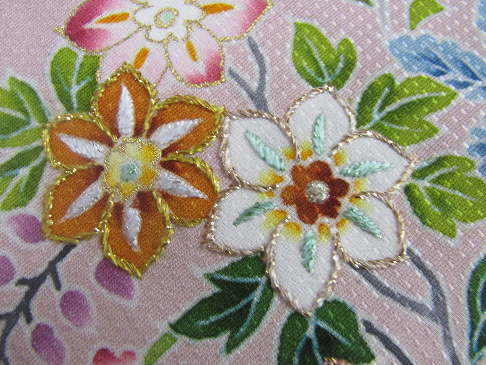 鉄線と思しき小さな花弁を拡大すると、中央の二つの花の丁寧な加工が見て取れる。特に刺繍のあしらいは精緻で、輪郭、花弁、咢には駒縫い、縫い切りと技法を変えて表現し、並んだ二つの花が対比して鮮やかな花姿になるよう、縫糸の色も工夫されている。