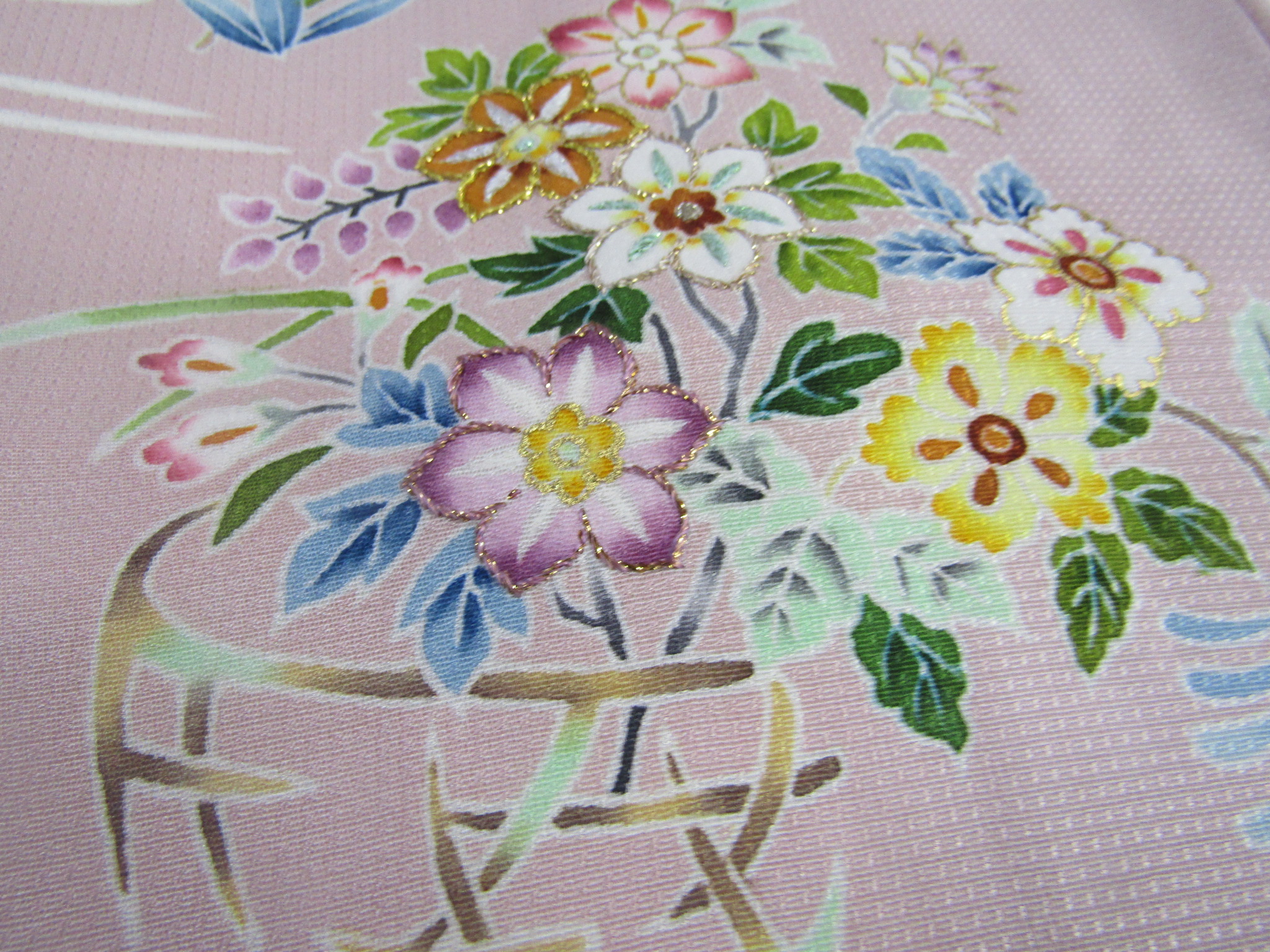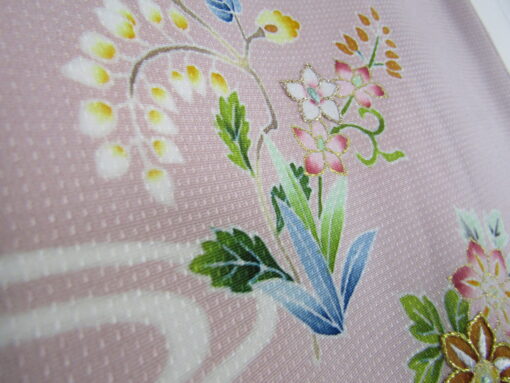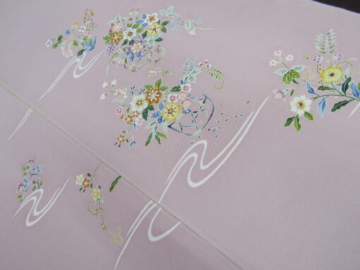 生地はドット模様が織り込まれた、珍しい紋意匠。花籠図案を拡大してみると、中に入れた小さな花一つ一つが、丁寧に糸目を引いて描かれ、色挿しを施していることが判る。巧みな暈しと配色の妙により、小さくとも繊細で美しい花姿として描かれている。友禅の緻密さが伺われるあしらい。